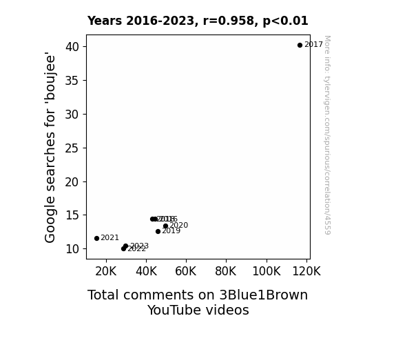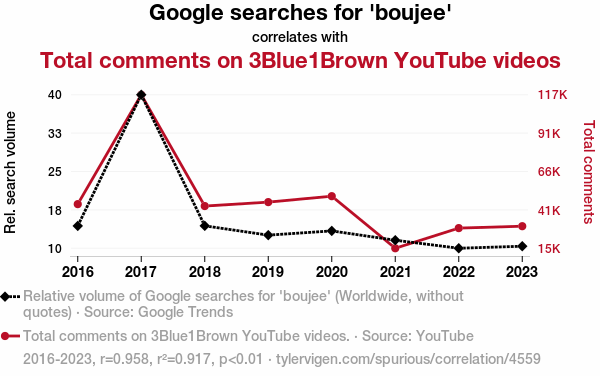 This means 91.7% of the change in the one variable (i.e., Total comments on 3Blue1Brown YouTube videos) is predictable based on the change in the other (i.e., Google searches for 'boujee') over the 8 years from 2016 through 2023.