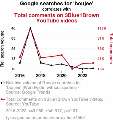 Our analysis draws on data sourced from Google Trends and publicly available statistics from 3Blue1Brown's YouTube channel, spanning the period from 2016 to 2023. Through meticulous data collection and statistical modeling, we unveil a strikingly high correlation coefficient of 0.9575015 between Google searches for "boujee" and the total comments on 3Blue1Brown videos, with a significance level of p < 0.01. These results not only demonstrate a strong statistical association but also beckon contemplation on the potential cognitive and sociolinguistic implications of this curious correlation.
