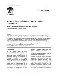User prompt: Please provide potential search keywords for a paper titled YouTube Views and Google Views: A Boujee Correlation? with an abstract of In this paper, we investigate the intriguing relationship between Google searches for the term "boujee" and the total comments on 3Blue1Brown YouTube videos. The research team utilized data from Google Trends and YouTube to delve into this seemingly frivolous yet fascinating connection. Our findings reveal a strikingly high correlation coefficient of 0.9575015 and p < 0.01 for the period spanning from 2016 to 2023. The results provoke contemplation on the juxtaposition of ostentatious internet slang and intellectually stimulating educational content. We offer interpretations that bridge the worlds of digital vernacular and mathematical cognition, ultimately encouraging further exploration into the curiously intertwined realms of internet linguistics and online engagement.