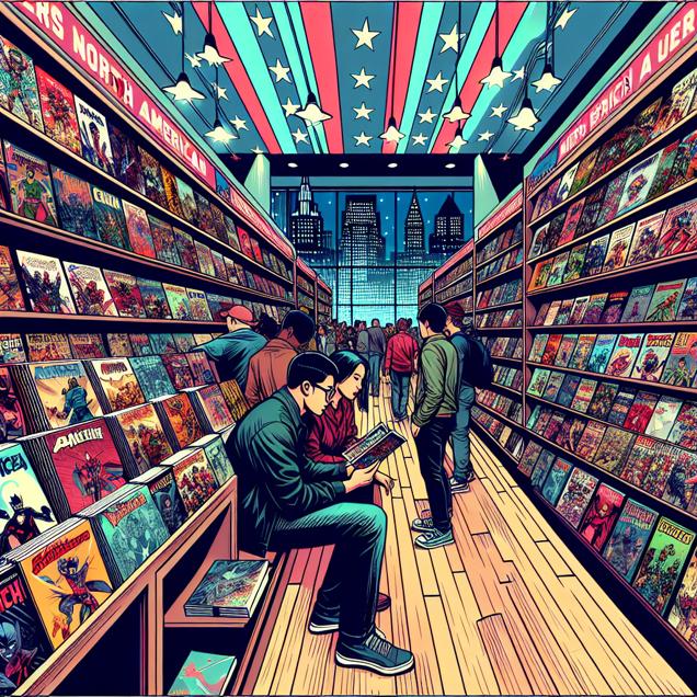Prompt: Generate an image showing a vibrant comic book shop with North American digital comic fans browsing through the latest releases. The comic book shelves should reflect the cool and trendy vibe of LEMMiNO's video titles, with colorful speech bubbles and eye-catching graphics. Show the scene alive with shared excitement and cultural enlightenment sparked by LEMMiNO's linguistic artistry, manifesting in the renewed enthusiasm and cool factor among the comic fans. The depiction should include only scenes, people, and objects, it should not include text or speech bubbles.