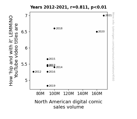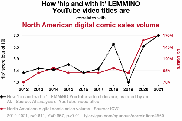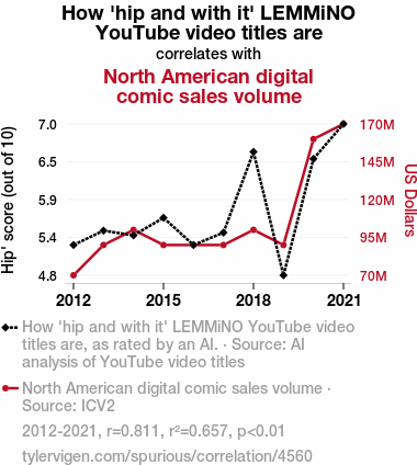 User prompt: Please make up a funny explanation for how an increase in How 'hip and with it' LEMMiNO YouTube video titles are caused North American digital comic sales volume to increase.