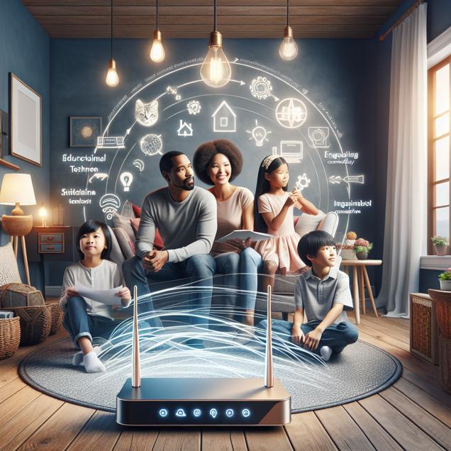 Prompt: "Generate an image that resembles a sophisticated, timeless magazine cover from Discovery, featuring a cozy living room setting. The scene should showcase a freshly painted wall and polished wooden floors, with a family gathered around a high-speed internet router. The family is depicted enjoying Technology Connections videos on a big screen TV, with the comments section scrolling rapidly with enthusiastic questions and discussions. The image should exude a sense of warmth and modern technological advancement, without being overly detailed." The depiction should include only scenes, people, and objects, it should not include text or speech bubbles.