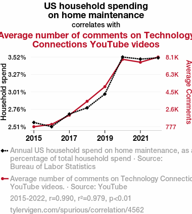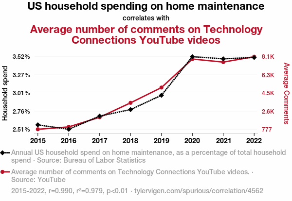 User prompt: Please make up a funny explanation for how an increase in US household spending on home maintenance caused Average number of comments on Technology Connections YouTube videos to increase. Add a funny one-liner at the end.