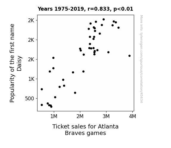 This means 69.4% of the change in the one variable (i.e., Ticket sales for Atlanta Braves games) is predictable based on the change in the other (i.e., Popularity of the first name Daisy) over the 45 years from 1975 through 2019.