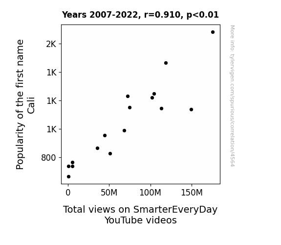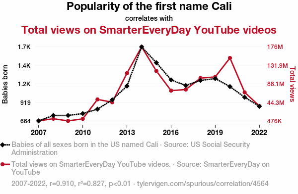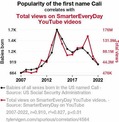 - The spurious research paper: The Calli-ing of Cali: A Statistical Analysis of the Relationship between Popularity of the Name Cali and Total Views on SmarterEveryDay YouTube Videos