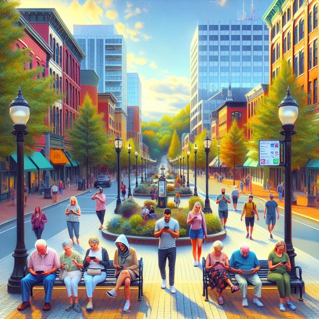 Prompt: [ A photo-realistic image ] of Manchester, New Hampshire, showing a serene cityscape with clear blue skies, families strolling along the streets while others relax at a quaint park. The improved air quality is evident in the vibrant colors and clarity of the surroundings. However, amidst the tranquil scene, subtle cues of illness and unease are woven into the image as more and more individuals are observed checking their health on smartphones or expressing concern on their faces. The juxtaposition of the lively city and the rising flu cases is captured in this mesmerizing visual. The depiction should include only scenes, people, and objects, it should not include text or speech bubbles.