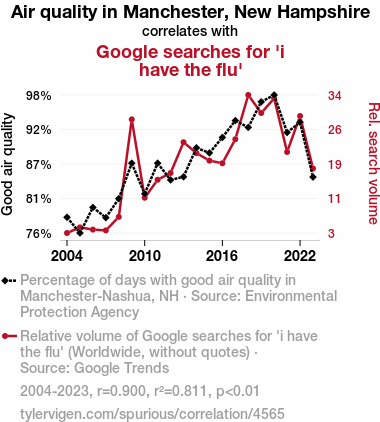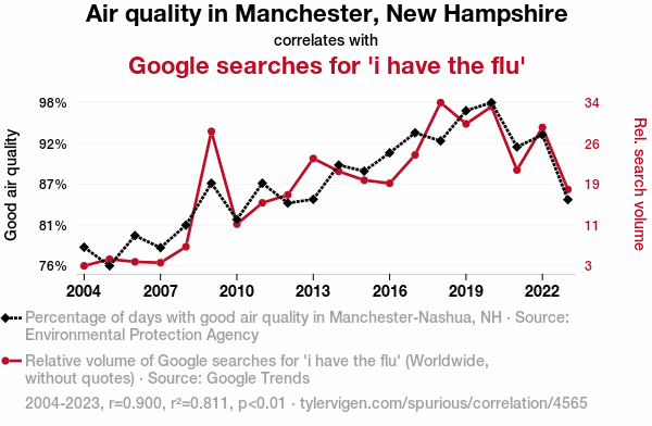 This means 81.1% of the change in the one variable (i.e., Google searches for 'i have the flu') is predictable based on the change in the other (i.e., Air quality in Manchester, New Hampshire) over the 20 years from 2004 through 2023.