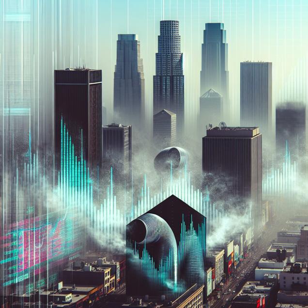 Prompt: Generate an image of a surreal cityscape in Vallejo, California, with skyscrapers obscured by thick, glitchy smog-like patterns that warp the skyline. Amidst the haze, numerous glitched storefronts display exaggerated, larger-than-life air purifiers while glitched stock market charts show Applied Materials' stock price ascending rapidly into the hazy, distorted sky. The depiction should include only scenes, people, and objects, it should not include text or speech bubbles.