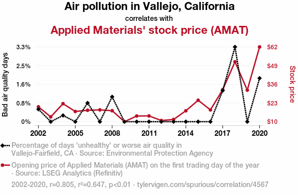 This means 64.7% of the change in the one variable (i.e., Applied Materials' stock price (AMAT)) is predictable based on the change in the other (i.e., Air pollution in Vallejo, California) over the 19 years from 2002 through 2020.