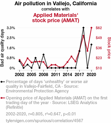 A linear line chart with years as the X-axis and two variables on the Y-axis. The first variable is Air pollution in Vallejo, California and the second variable is Applied Materials' stock price (AMAT).  The chart goes from 2002 to 2020, and the two variables track closely in value over that time. Small Image