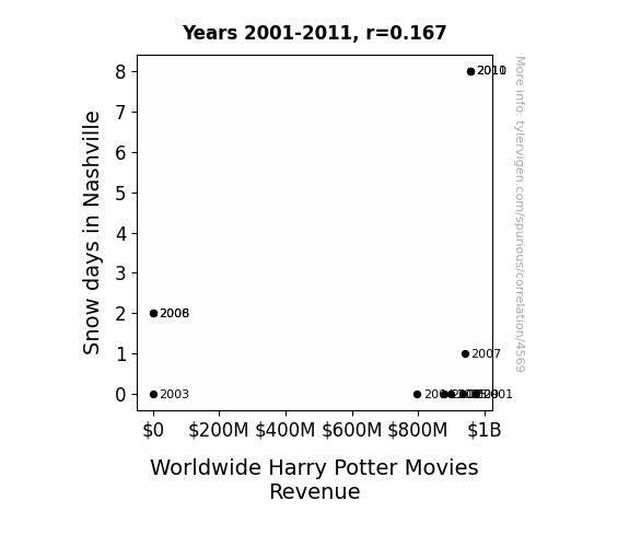 User prompt: Please make up a funny explanation for how an increase in Snow days in Nashville caused Worldwide Harry Potter Movies Revenue to increase.\Make it sound serious until the end.