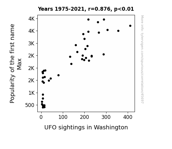 This means 76.8% of the change in the one variable (i.e., UFO sightings in Washington) is predictable based on the change in the other (i.e., Popularity of the first name Max) over the 47 years from 1975 through 2021.