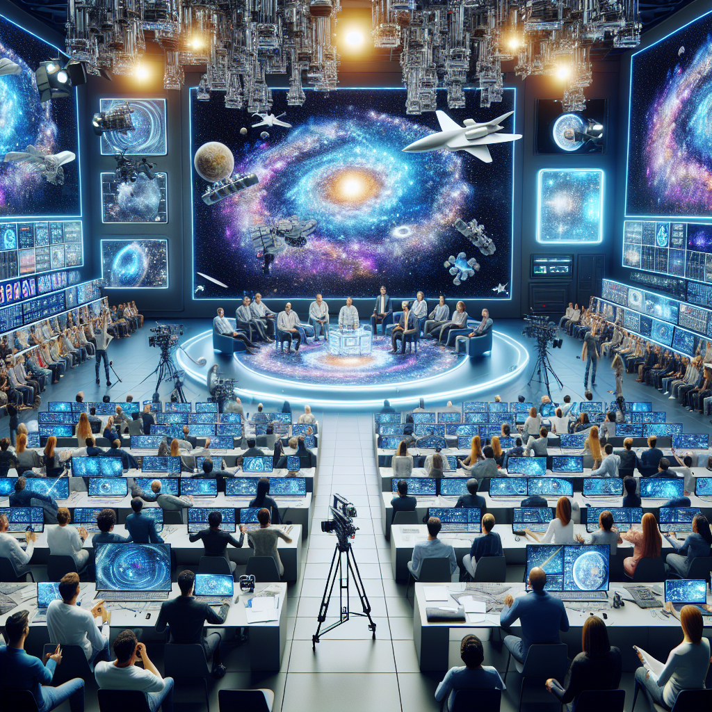 Prompt: Prompt: Generate an image of a high-tech room filled with screens and cameras. In the center, a group of passionate PBS Space Time hosts huddle around a whiteboard, covered in complex equations and diagrams. On one side of the room, a long line of eager Amirs wait for the next Space Time video release. As the hosts hit the record button, the Amirs' eyes light up with anticipation. As questions and ideas from the Amirs lead to the hosts continuously adding new segments, the once average-length videos expand exponentially. The room buzzes with engaging space-time discussions, creating an unrivaled cosmic phenomenon. The depiction should include only scenes, people, and objects, it should not include text or speech bubbles.