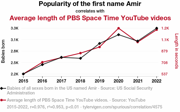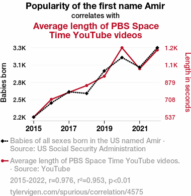 User prompt: Please provide potential search keywords for a paper titled The Amir Effect: A Quantum Connection Between Moniker Popularity and PBS Space Time Video Length with an abstract of In this study, we investigate the peculiar connection between the popularity of the first name "Amir" and the average length of PBS Space Time YouTube videos. The link between names and video durations may seem far-fetched, but our comprehensive analysis utilizing data from the US Social Security Administration and YouTube has revealed some fascinating results. With the correlation coefficient of 0.9763523 and p < 0.01 for the period spanning 2015 to 2022, our findings indicate a remarkably strong statistical association between the two variables.