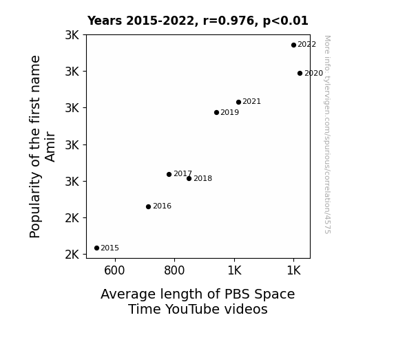 In this study, we investigate the peculiar connection between the popularity of the first name "Amir" and the average length of PBS Space Time YouTube videos. The link between names and video durations may seem far-fetched, but our comprehensive analysis utilizing data from the US Social Security Administration and YouTube has revealed some fascinating results. With the correlation coefficient of 0.9763523 and p < 0.01 for the period spanning 2015 to 2022, our findings indicate a remarkably strong statistical association between the two variables.