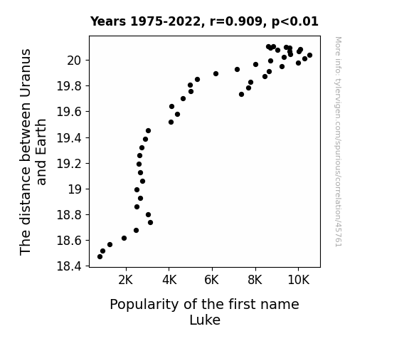 This means 82.6% of the change in the one variable (i.e., Popularity of the first name Luke) is predictable based on the change in the other (i.e., The distance between Uranus and Earth) over the 48 years from 1975 through 2022.