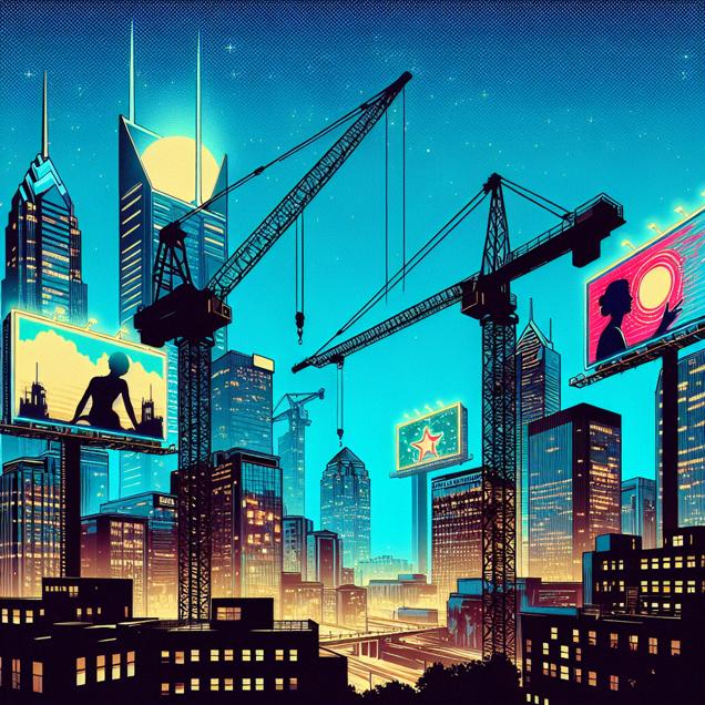 Prompt: Generate an image of a bustling North Carolina city skyline, with cranes reaching toward the sky. Flashy billboards promote MrBeast's latest YouTube videos, featuring exaggerated and captivating titles. The city is alive with the palpable competition as crane operators crane their necks to catch attention, mirroring the provocative clickbait titles vying for viewers' eyes. The depiction should include only scenes, people, and objects, it should not include text or speech bubbles.