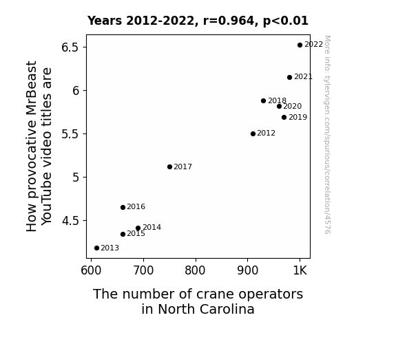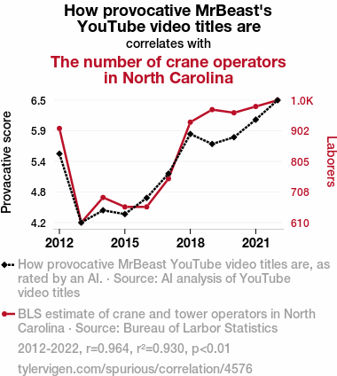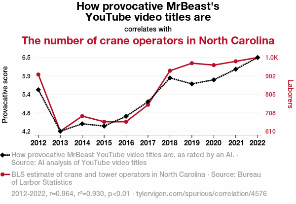This means 93% of the change in the one variable (i.e., The number of crane operators in North Carolina) is predictable based on the change in the other (i.e., How provocative MrBeast's YouTube video titles are) over the 11 years from 2012 through 2022.
