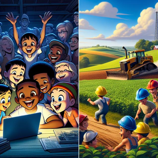 Prompt: [ Whimsical illustration ] Depicting this scene: In a colorful and whimsical landscape, a group of young people with beaming smiles gather around a laptop, bursting with laughter as they read the witty and exciting titles of The Game Theorists' YouTube videos. The laptop screen radiates with captivating thumbnails, each more thrilling than the last. Amidst rolling hills, in a delightful rural setting, a group of individuals adorned in vibrant hard hats operate gas compressors and pumps with infectious enthusiasm. Their joyful energy infuses the scene with playful charm as they go about their work in the heart of Ohio. The depiction should include only scenes, people, and objects, it should not include text or speech bubbles.