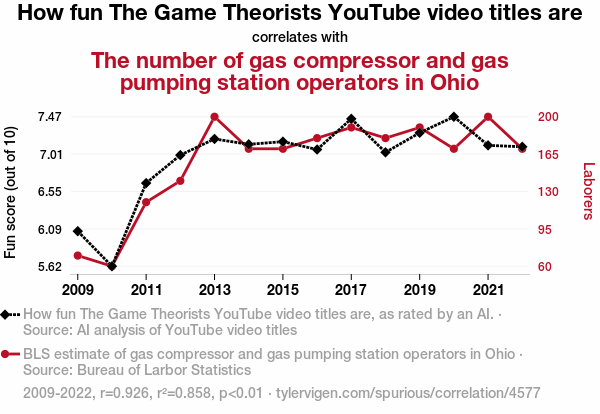 User prompt: Please make up a funny explanation for how an increase in How fun The Game Theorists YouTube video titles are caused The number of gas compressor and gas pumping station operators in Ohio to increase. Add a funny one-liner at the end.