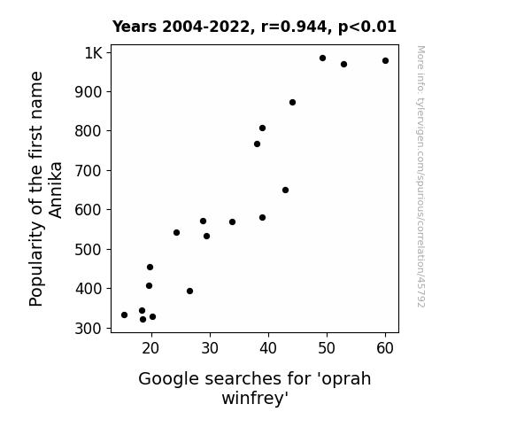 This means 89.1% of the change in the one variable (i.e., Google searches for 'oprah winfrey') is predictable based on the change in the other (i.e., Popularity of the first name Annika) over the 19 years from 2004 through 2022.