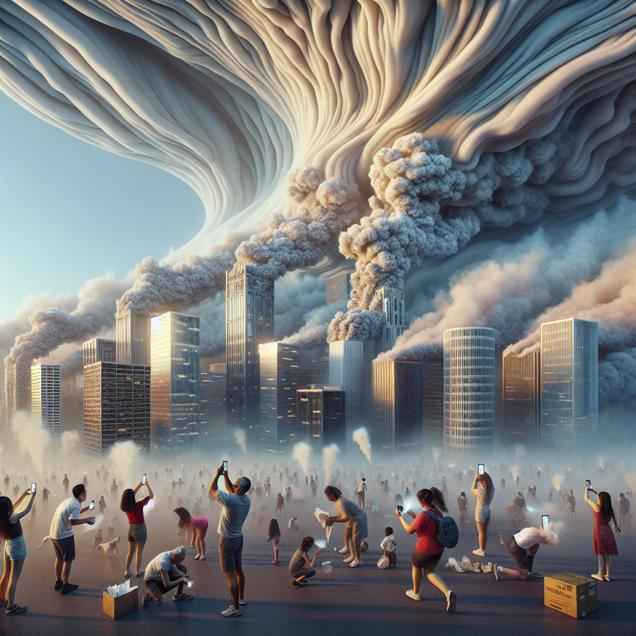 ChatGPT: Generate an image of an otherworldly cityscape in Longview, Washington, enveloped in a shroud of dense, iridescent smoke. The smoke swirls and dances around towering skyscrapers while people below are depicted urgently searching on their phones, their faces illuminated by the faint glow of the screens. Some individuals can be seen clutching precious rolls of toilet paper, which are being repurposed as makeshift filters against the thick, choking haze. The scene evokes a sense of urgency and desperation amidst a fantastical setting.
