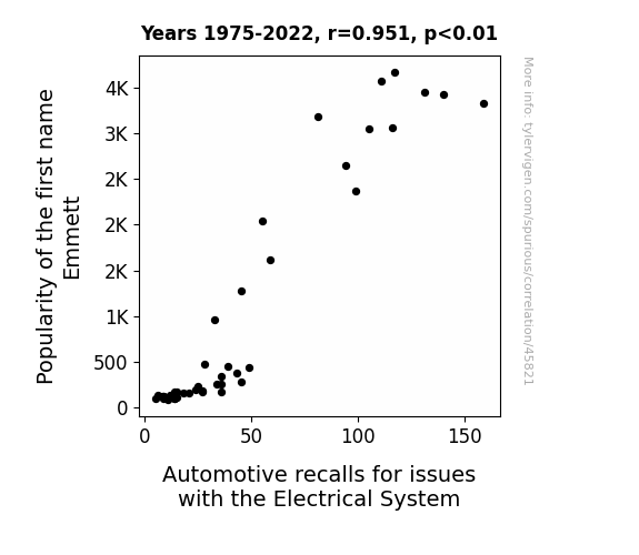 This means 90.4% of the change in the one variable (i.e., Automotive recalls for issues with the Electrical System) is predictable based on the change in the other (i.e., Popularity of the first name Emmett) over the 48 years from 1975 through 2022.