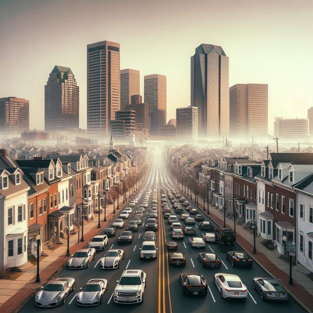 User prompt: Please describe a visual scene that prominently depicts both Popularity of the first name Lexus and Air pollution in Dover, Delaware, in the following situation: As the name Lexus gained popularity, more parents were subconsciously influenced to buy luxury cars, leading to a surge in high-end vehicle sales. These sleek, gas-guzzling rides then hit the streets of Dover, Delaware, revving their engines and contributing to a noticeable increase in air pollution. It seems like the 'Lexus effect' wasn't just limited to the baby name charts, but also made its way into the local environment, leaving a smokescreen of confusion in its wake. Remember, sometimes the road to smoggy skies is paved with good intentions and a love for luxurious autos!. Keep the description simple.