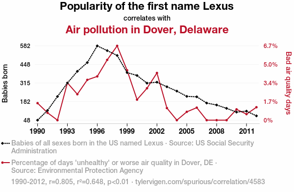 2. Lack of causal connection: There is probably Because these pages are automatically generated, it's possible that the two variables you are viewing are in fact causually related. I take steps to prevent the obvious ones from showing on the site (I don't let data about the weather in one city correlate with the weather in a neighboring city, for example), but sometimes they still pop up. If they are related, cool! You found a loophole.