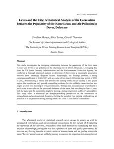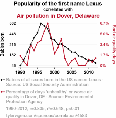 User prompt: Please provide potential search keywords for a paper titled Lexus and the City: A Statistical Analysis of the Correlation between the Popularity of the Name Lexus and Air Pollution in Dover, Delaware with an abstract of This study investigates the intriguing relationship between the popularity of the first name "Lexus" and levels of air pollution in the charming city of Dover, Delaware. Leveraging data from the US Social Security Administration and the Environmental Protection Agency, we conducted a thorough empirical analysis to determine if there exists a meaningful association between these seemingly disparate factors.