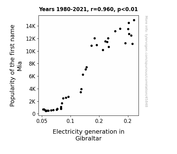 This means 92.2% of the change in the one variable (i.e., Electricity generation in Gibraltar) is predictable based on the change in the other (i.e., Popularity of the first name Mia) over the 42 years from 1980 through 2021.