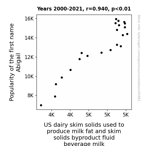 This means 88.3% of the change in the one variable (i.e., US dairy skim solids used to produce milk fat and skim solids byproduct fluid beverage milk) is predictable based on the change in the other (i.e., Popularity of the first name Abigail) over the 22 years from 2000 through 2021.