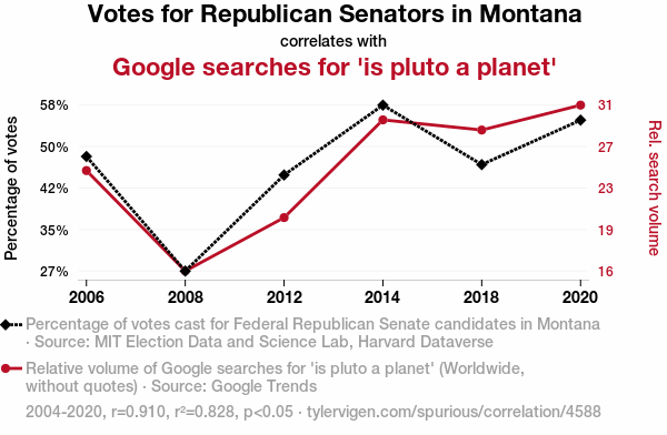A linear line chart with years as the X-axis and two variables on the Y-axis. The first variable is Votes for Republican Senators in Montana and the second variable is Google searches for 'is pluto a planet'.  The chart goes from 2004 to 2020, and the two variables track closely in value over that time. Small Image