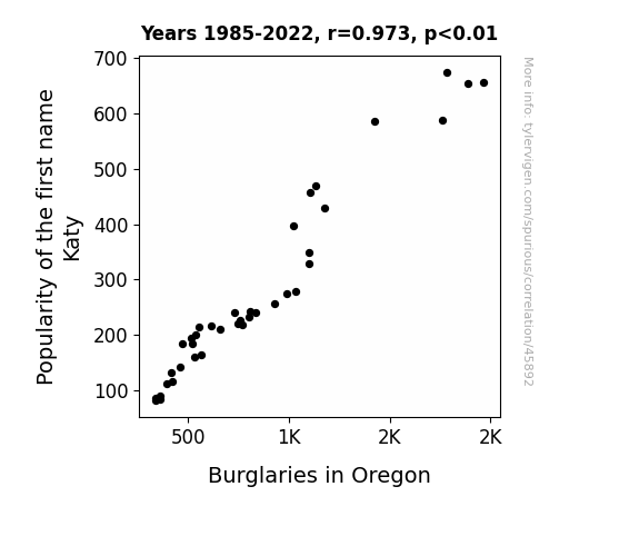 This means 94.7% of the change in the one variable (i.e., Burglaries in Oregon) is predictable based on the change in the other (i.e., Popularity of the first name Katy) over the 38 years from 1985 through 2022.