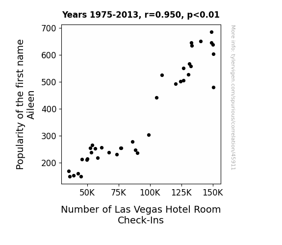 This means 90.2% of the change in the one variable (i.e., Number of Las Vegas Hotel Room Check-Ins) is predictable based on the change in the other (i.e., Popularity of the first name Aileen) over the 39 years from 1975 through 2013.