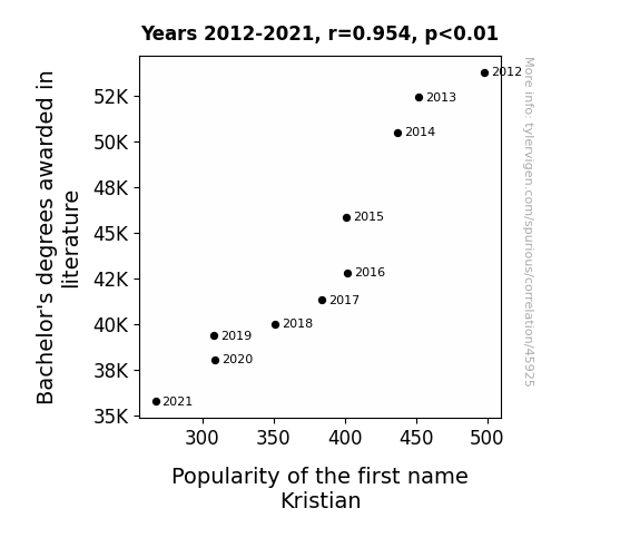 This means 90.9% of the change in the one variable (i.e., Popularity of the first name Kristian) is predictable based on the change in the other (i.e., Bachelor's degrees awarded in literature) over the 10 years from 2012 through 2021.