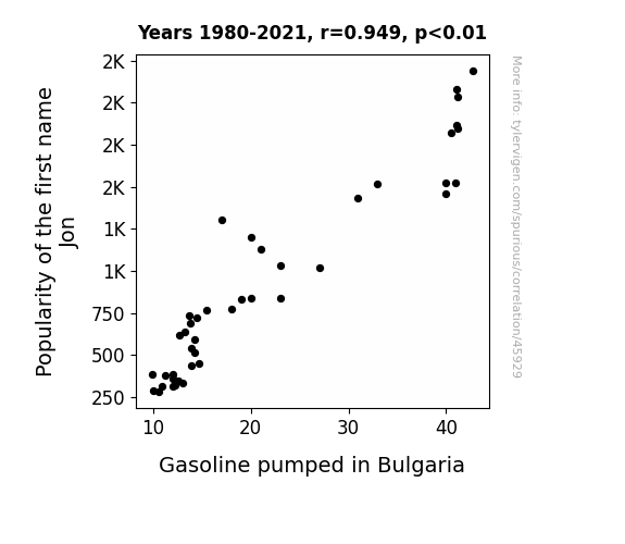 This means 90% of the change in the one variable (i.e., Gasoline pumped in Bulgaria) is predictable based on the change in the other (i.e., Popularity of the first name Jon) over the 42 years from 1980 through 2021.