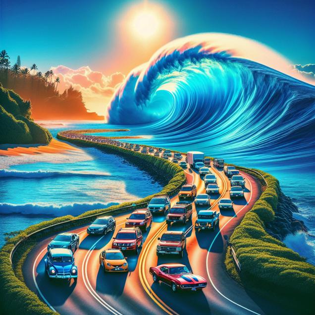 ChatGPT: Generate an image of a vibrant Hawaiian coastline, with a striking wave breaking against the shore. Alongside the wave, a convoy of cars appears to be driving towards the ocean, each one exuding distinct personality and characteristics. There is an unmistakable atmosphere of freedom and independence, as if the cars themselves have come to life to partake in the communal momentum of Libertarian support in Hawaii, intertwining the realms of politics and automotive autonomy in an unexpected and visually captivating manner.