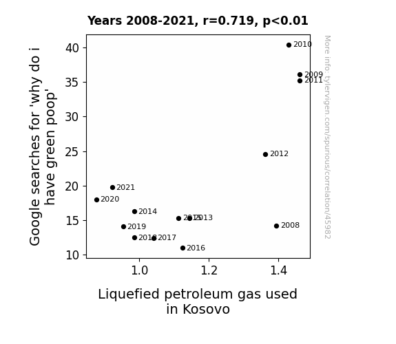 This means 51.7% of the change in the one variable (i.e., Liquefied petroleum gas used in Kosovo) is predictable based on the change in the other (i.e., Google searches for 'why do i have green poop') over the 14 years from 2008 through 2021.