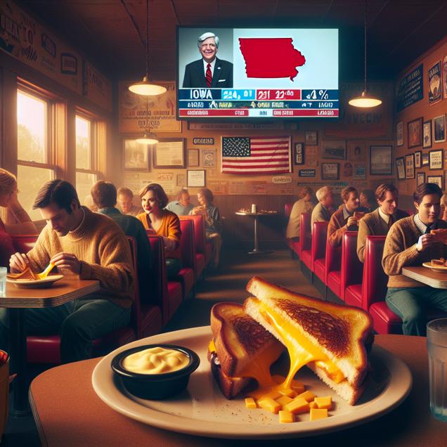 ChatGPT: Generate an image capturing the scene of a cozy Iowa diner where people are savoring classic grilled cheese sandwiches, with the melted American cheese oozing out from the sides. In the background, a local TV station displays the votes being counted, showing the map of Iowa gradually turning a vibrant shade of Republican red. The image should be hyper-realistic, with attention to detail in capturing the warmth and comfort of the diner atmosphere and the anticipation of the election results on the TV screen.