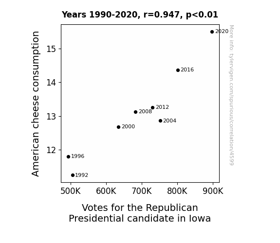 This means 89.7% of the change in the one variable (i.e., Votes for the Republican Presidential candidate in Iowa) is predictable based on the change in the other (i.e., American cheese consumption) over the 8 years from 1990 through 2020.