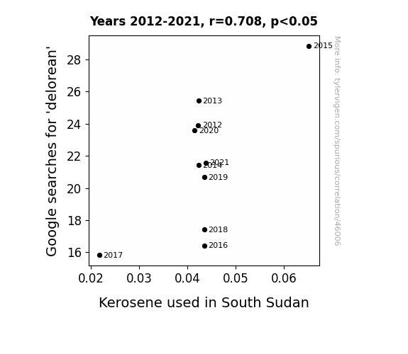 This means 50.2% of the change in the one variable (i.e., Kerosene used in South Sudan) is predictable based on the change in the other (i.e., Google searches for 'delorean') over the 10 years from 2012 through 2021.