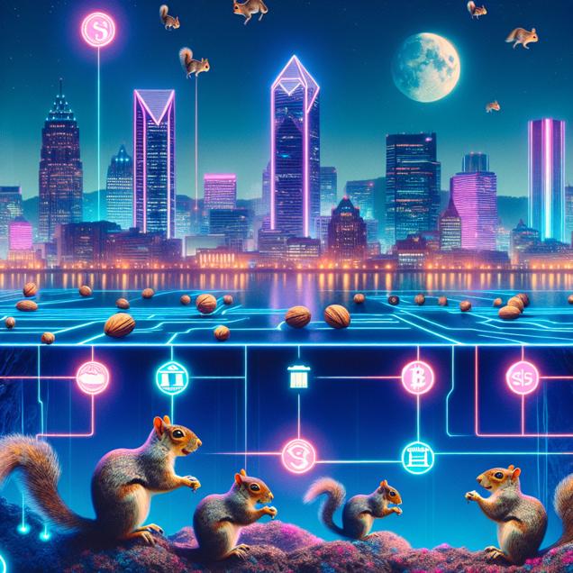 User prompt: Please respond with an image generation prompt that would be likely to create an interesting visual using DALLE-3, using the following style: [ Cyberpunk ] and depicting this scene: In Charleston, West Virginia, the sky is clearer than ever as the air pollution has decreased significantly. Local squirrels, brimming with energy, are seen scurrying and burying acorns at an unprecedented rate. As a result, a network of nutty financial institutions is mysteriously formed underground. Soon, traditional investor confidence wanes and Lloyds Banking Group's stock price declines, as the competition from the squirrel banking industry takes hold. Keep the visual depiction simple. Do not include any words or speech bubbles.