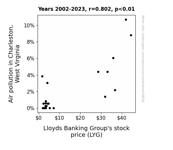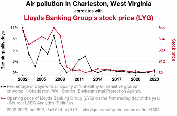 - The spurious research paper: Air-pollution and Money in 'Charleston's Web': A Nitty-Gritty Analysis of Lloyds Banking Group's Stock Price and the Ambient Air Quality in Charleston, West Virginia