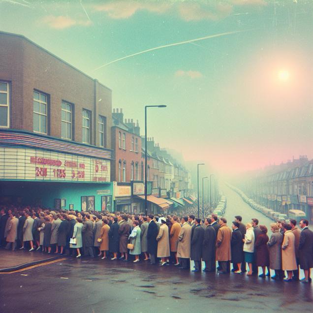 Prompt: Generate an image in the style of a vintage Polaroid photo showing a line of people extending down a bustling street in Blacksburg, Virginia. The hazy sky overhead is filled with smog, creating an air of discomfort. The people in the line are eagerly waiting outside the local movie theater, seeking solace from the polluted atmosphere. The theater's marquee stands out, invitingly lit, promising a break from the smoggy city. The muted, retro tones and soft focus of the Polaroid evoke a sense of nostalgia and the longing for escape. The depiction should include only scenes, people, and objects, it should not include text or speech bubbles.