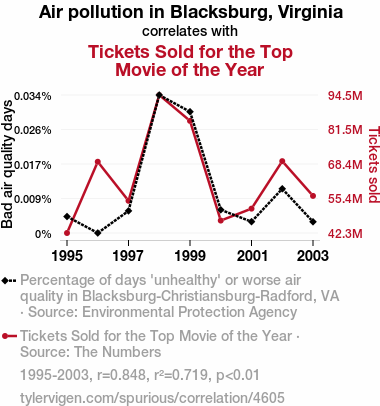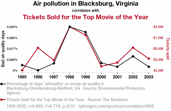 - The spurious research paper: Clear Skies, Full Theaters: Investigating the Relationship Between Air Quality and Box Office Success in Blacksburg, Virginia