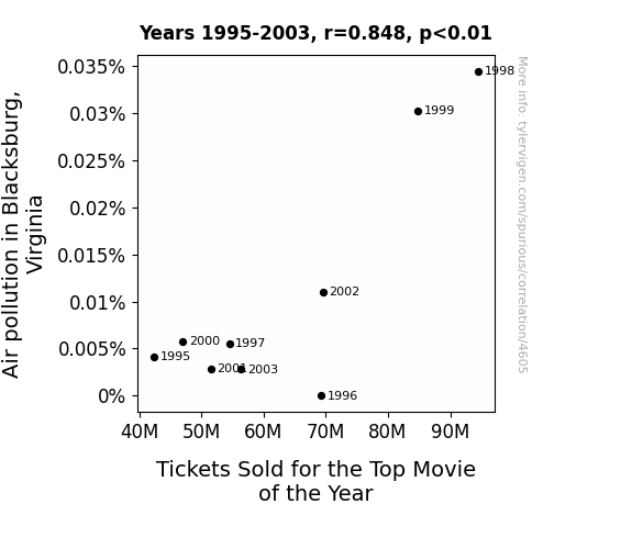This means 71.9% of the change in the one variable (i.e., Tickets Sold for the Top Movie of the Year) is predictable based on the change in the other (i.e., Air pollution in Blacksburg, Virginia) over the 9 years from 1995 through 2003.