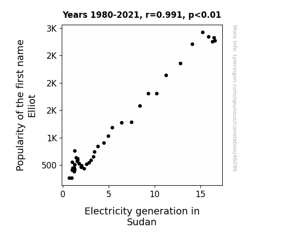 This means 98.3% of the change in the one variable (i.e., Electricity generation in Sudan) is predictable based on the change in the other (i.e., Popularity of the first name Elliot) over the 42 years from 1980 through 2021.