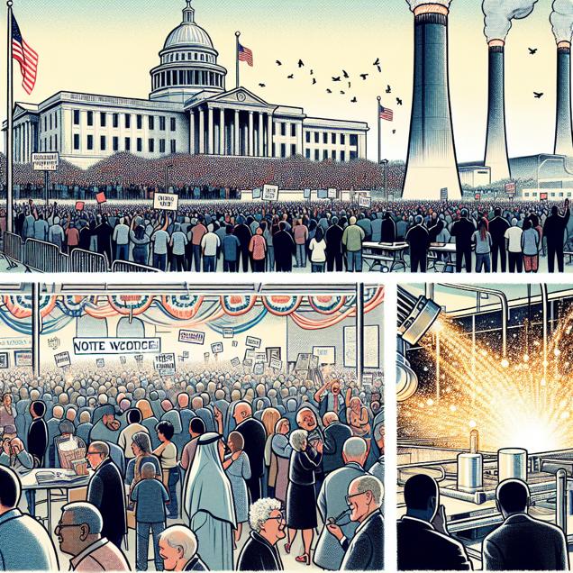 Prompt: Generate an image of a bustling voting center in Massachusetts, captured during a moment of heightened excitement as crowds of people gather to cast their votes for the Democrat Presidential candidate. The atmosphere is charged with anticipation, and the energy from the surging support creates powerful ripples that echo through the political landscape. As the energy spreads like a seismic wave, visualize the connection between the fervent political enthusiasm and the consequential shift towards renewable energy in Indonesia, symbolized by the spark of a geothermal power movement. The visual should emanate a sense of electrifying energy and convey the transformative impact of collective action. The depiction should include only scenes, people, and objects, it should not include text or speech bubbles.