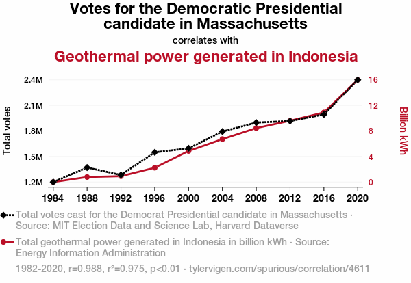 User prompt: Please provide potential search keywords for a paper titled The Democra-Magma Connection: Exploring the Surprising Relationship Between Democratic Vote Share in Massachusetts and Geothermal Power Generation in Indonesia with an abstract of This paper presents a comprehensive analysis of the curious correlation between the percentage of votes for the Democratic presidential candidate in the state of Massachusetts and the annual geothermal power generation in Indonesia. Utilizing data from the MIT Election Data and Science Lab, Harvard Dataverse, and the Energy Information Administration, this study covers the time period from 1982 to 2020. Through rigorous statistical analysis, a remarkably high correlation coefficient of 0.9875980 and a statistically significant p-value of less than 0.01 were observed. The implications of these findings are far-reaching, raising questions about the interplay between political preference in Massachusetts and geothermal energy extraction halfway across the globe. This study not only sheds light on these unexpected associations but also underscores the importance of exploring seemingly unrelated phenomena in the pursuit of scientific understanding.